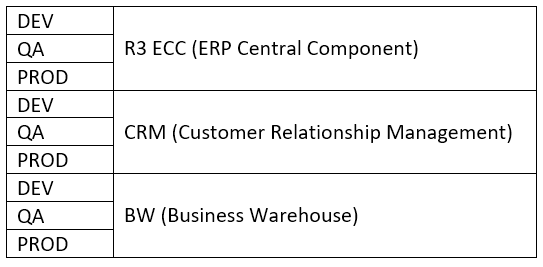 The most basic SAP environments you need as a consultant will be the (1) Development, (2) Quality Assurance / Test, and (3) Production / Live System.